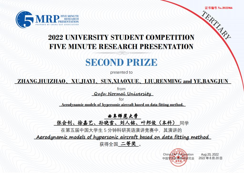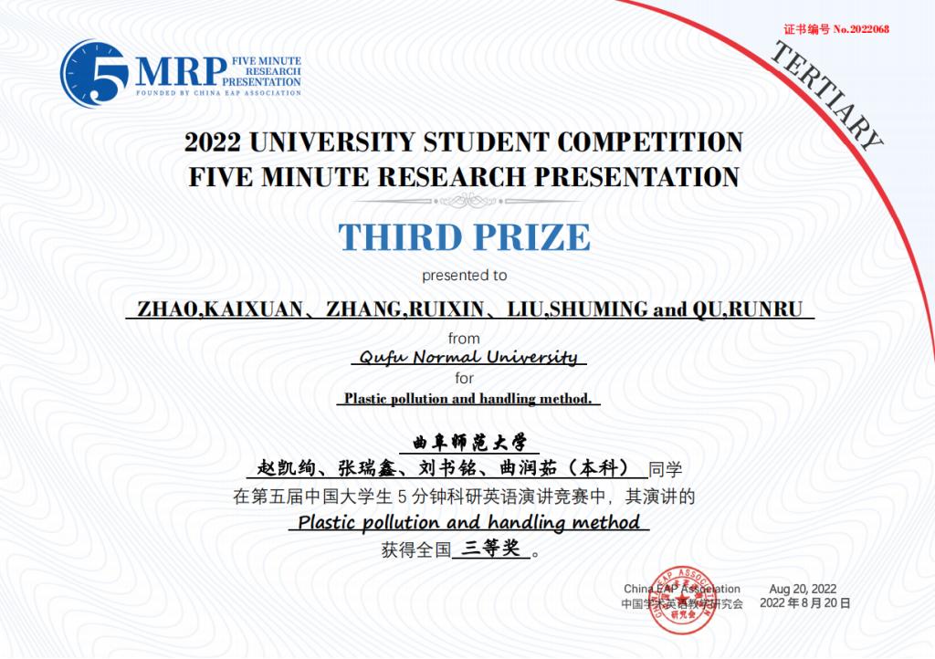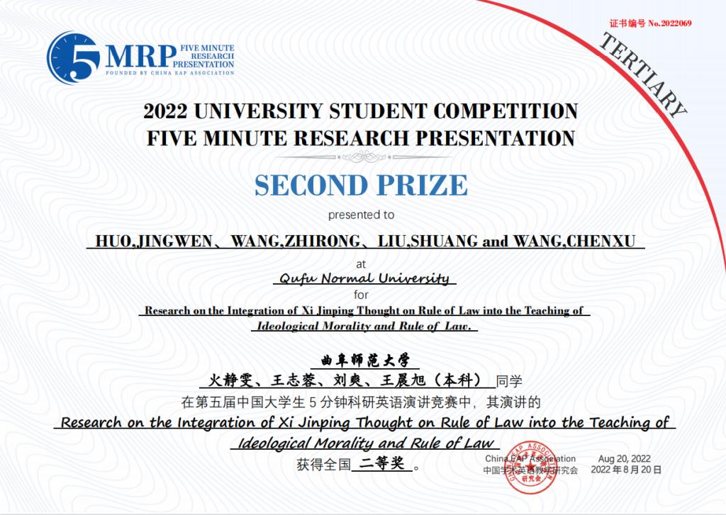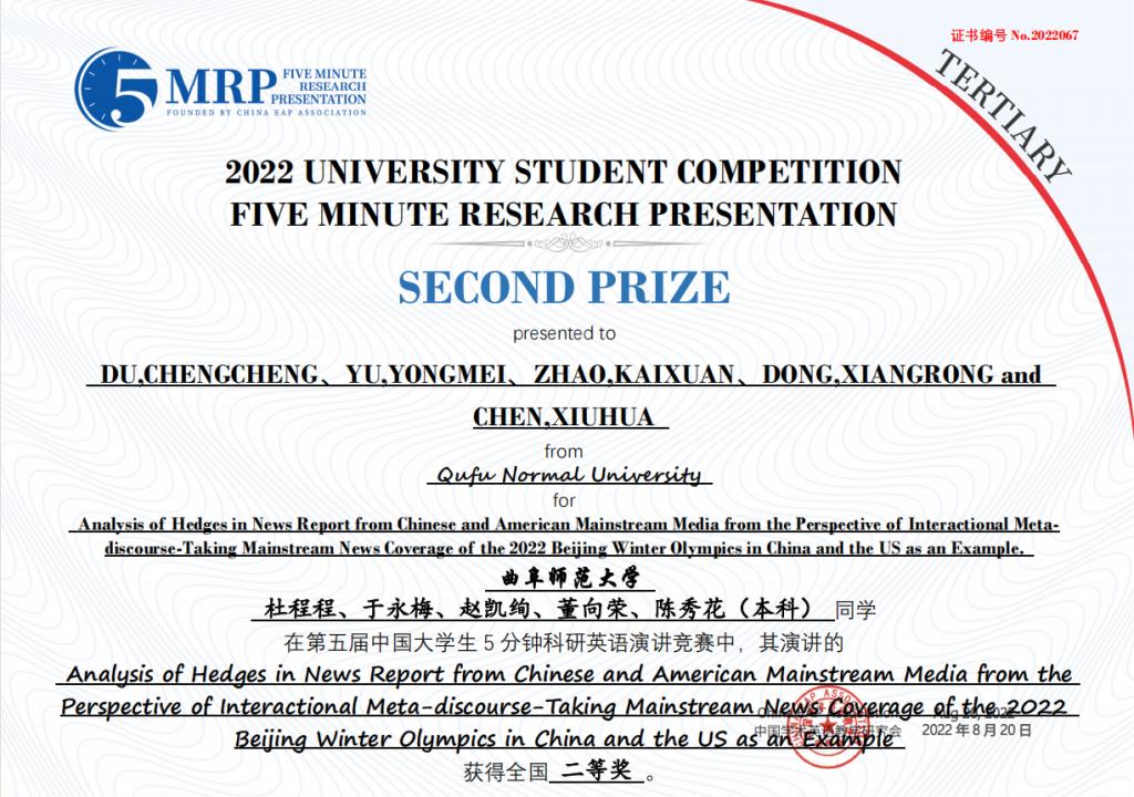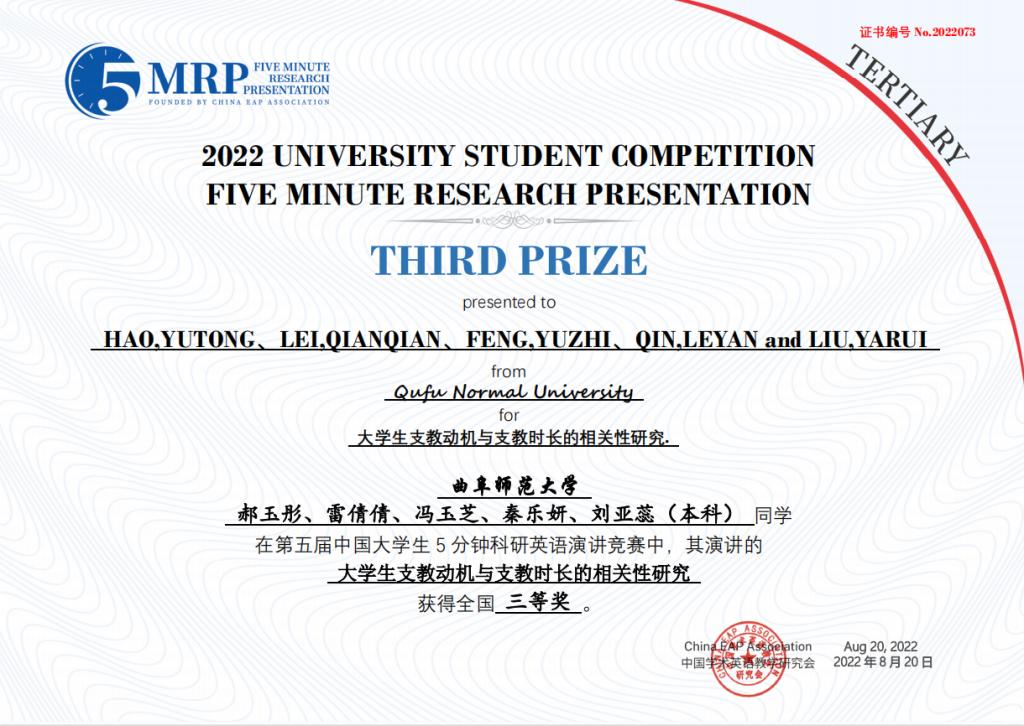 附2:第五届中国大学生五分钟科研英语演讲大赛环球官方网站_环球(中国)股份有限公司获奖团队获奖证书