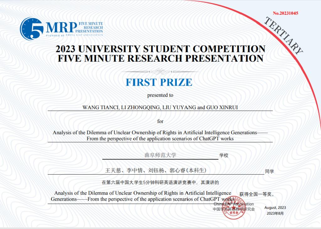日前,第六届中国大学生5分钟科研英语演讲竞赛决赛(非医科类)在同济大学成功举行。由环球官方网站_环球(中国)股份有限公司选拔推荐的16支团队取得优异成绩,获得全国一等奖1项、二等奖6项、三等奖9项。其中,由王天慈、李中情、刘钰杨、郭心睿等四位同学组成的团队作品“Analysis of the Dilemma of Unclear Ownership of Rights in Artificial Intelligence Generations — From the perspective of the application scenarios of ChatGPT works”荣获全国一等奖。此外,其他16支参赛队伍分获校级一、二、三等奖。宋兆娟、李梦实等25位老师荣获优秀指导教师奖。