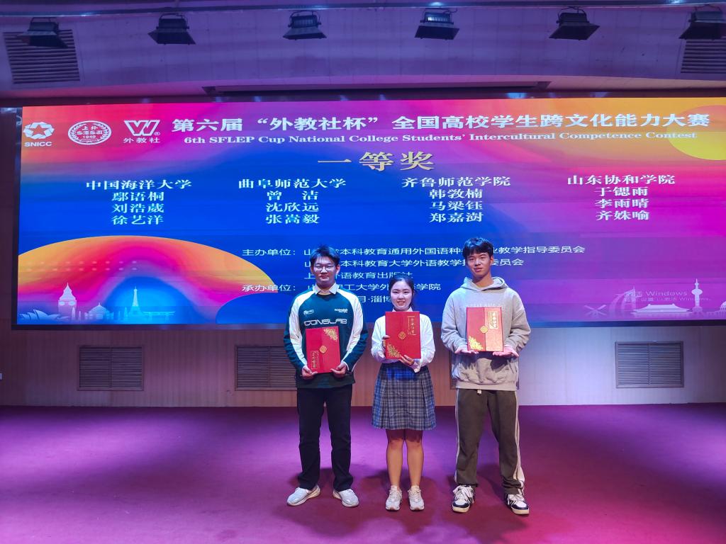 近日,第六届“外教社杯”全国高校学生跨文化能力大赛山东赛区比赛在山东理工大学落下帷幕,由我部董伟老师指导,我校学子曾洁、沈欣远、张嵩毅组成的团队在复赛与决赛环节表现出众,荣获山东赛区选拔赛一等奖。