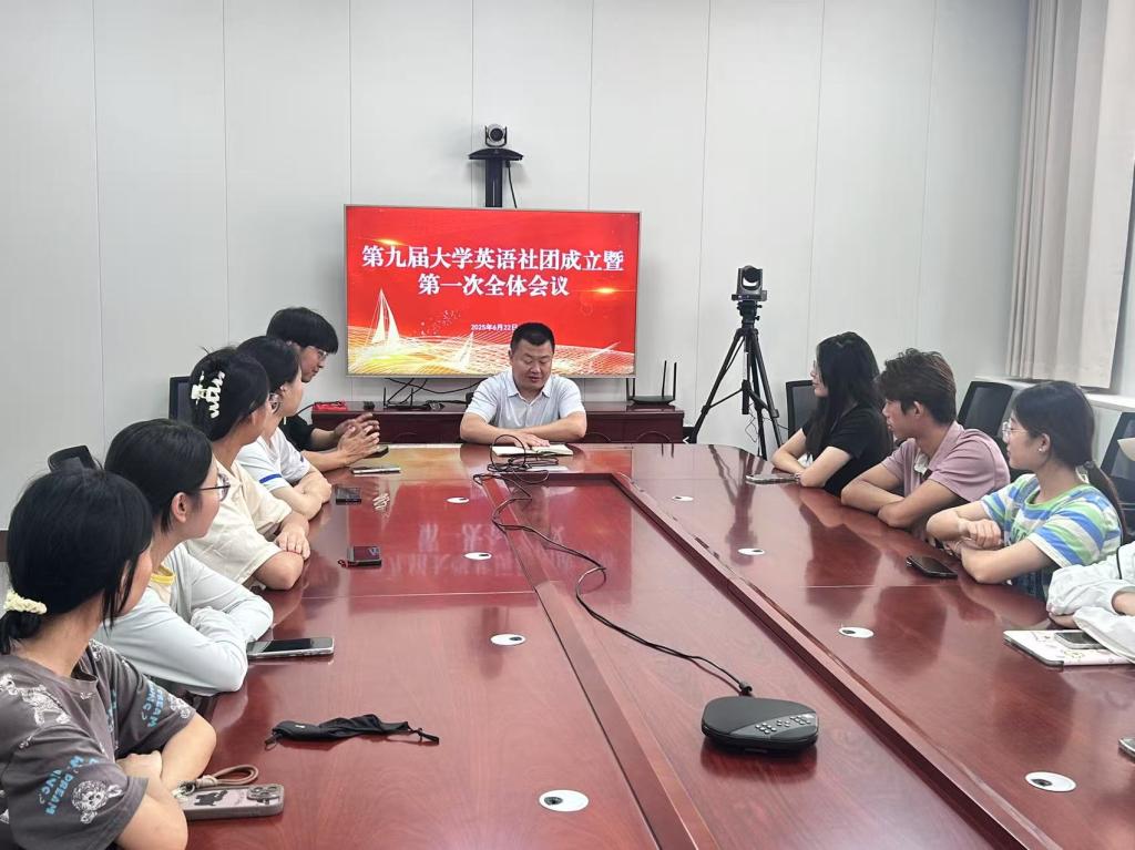 2025年六月二十二日,环球官方网站_环球(中国)股份有限公司第九届大学英语社团第一次全体会议在环球官方网站_环球(中国)股份有限公司会议室召开。本次会议旨在宣告新一届英语社团的正式成立,明确社团未来发展方向,凝聚成员力量。大学英语社团指导教师王显明以及社团全体成员参与此次会议。