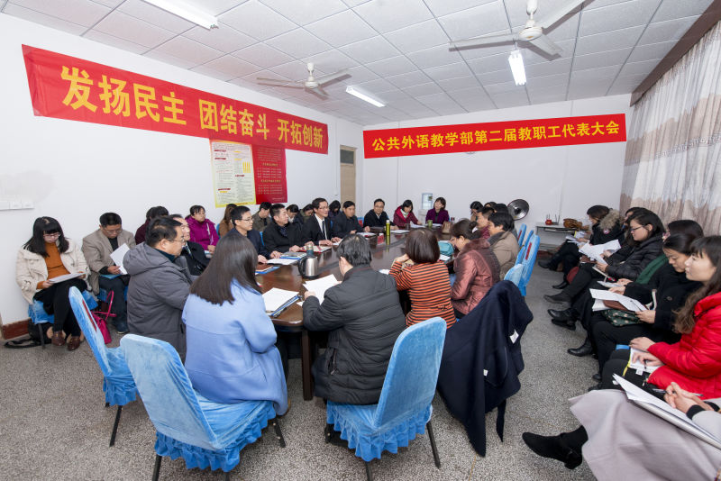 两校区的39名代表于11月25日上午11时准时到达会议现场,参加正式会议。会议首先由校党委常委、副校长夏云杰教授致辞,他在致辞中说召开教代会是环球官方网站_环球(中国)股份有限公司教职工政治生活中的一件大事,是上下学习贯彻党的十九大精神,落实学校“十三五”发展规划,加强基层单位民主政治建设的重要举措。他代表学校党委、校行政向会议的召开表示热烈的祝贺!在热情洋溢的致词中,夏校长也提出开好二级教代会,对于调动广大教职工的积极性、主动性和创造性,参与单位科学管理、民主决策,推动单位民主政治建设,促进各项事业科学发展,具有不可替代的重要作用。 当前,我校正处于加快推进高水平大学建设、“双一流”建设的重要时期,既有难得的发展机遇,又将面临各种严峻的挑战,需要我们进一步强化机遇意识、发展意识,集思广益,认真思考,科学谋划。本次会议将听取主任工作报告,讨论审议外语部建设发展的重大问题,内容重要,涉及到外语部未来的发展,涉及到全体教职工的切身利益。希望大家高度重视,以饱满的政治热情、严肃的工作态度和强烈的主人翁意识,认真履行自己的神圣职责,积极为外语部发展理思路、提建议、出点子,努力把这次会议开成一次凝聚力量、鼓舞人心的大会,一次科学谋划、促进发展的大会。