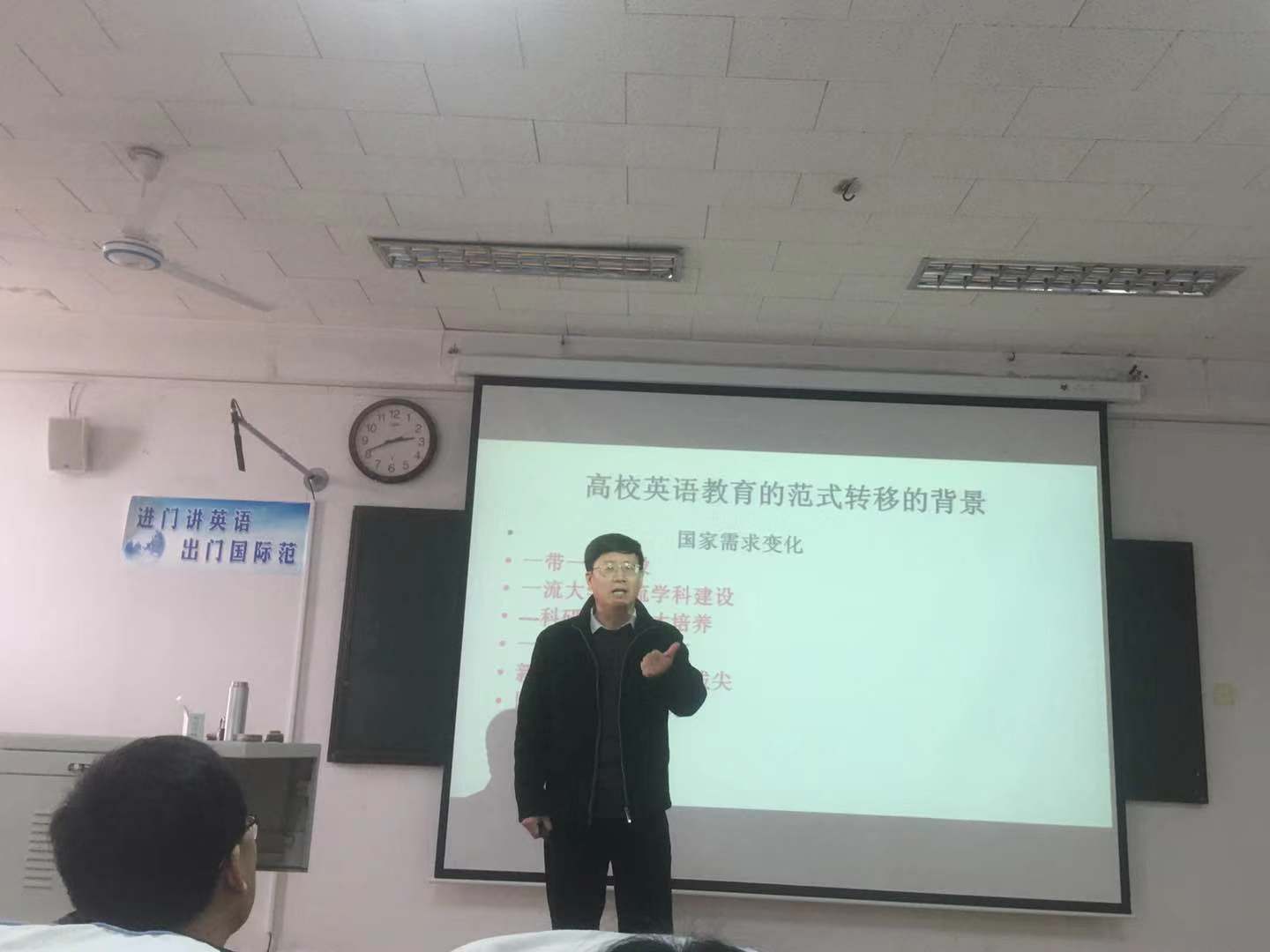 讲座伊始,蔡基刚教授以高校英语教育的范式转移的背景为出发点,从国家,社会,技术以及学生方面向我们阐述需求变化。另外,他又从公共英语本质为出发点,向我们提出了ESP以及ESAP等。随后,他又向我们讲解了学术素养的要求以及学生如何培养提出问题以及解决问题的科研能力。最后,蔡基刚教授与教师和同学们展开了亲切互动,耐心解答了老师、同学们的问题。
