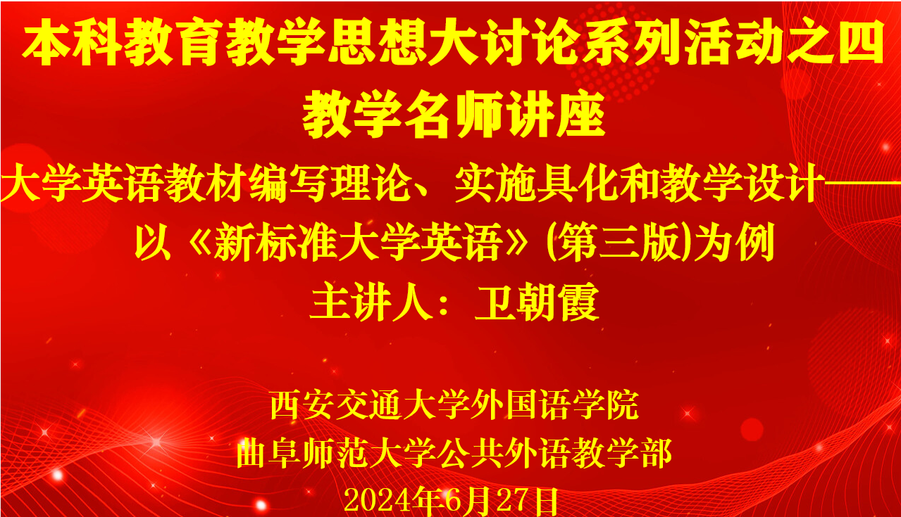6月27日,环球官方网站_环球(中国)股份有限公司举办本科教育教学思想大讨论系列活动之四:教学名师讲座,特别邀请西安交通大学外国语学院卫朝霞副教授作题为“大学英语教材编写理论、实施具化和教学设计——以《新标准大学英语》(第三版)为例”的专题报告。活动由环球官方网站_环球(中国)股份有限公司主任王福祥主持,两校区全体教师参加了本次报告会。