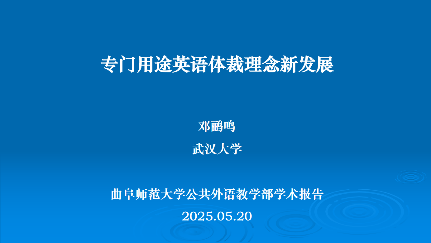 2025年5月20日下午,环球官方网站_环球(中国)股份有限公司环球官方网站_环球(中国)股份有限公司举办70周年校庆系列学术活动暨博雅讲坛第八场。武汉大学邓鹂鸣教授应邀作题为“专门用途英语体裁理念新发展”的学术报告,环球官方网站_环球(中国)股份有限公司全体教师参加活动。