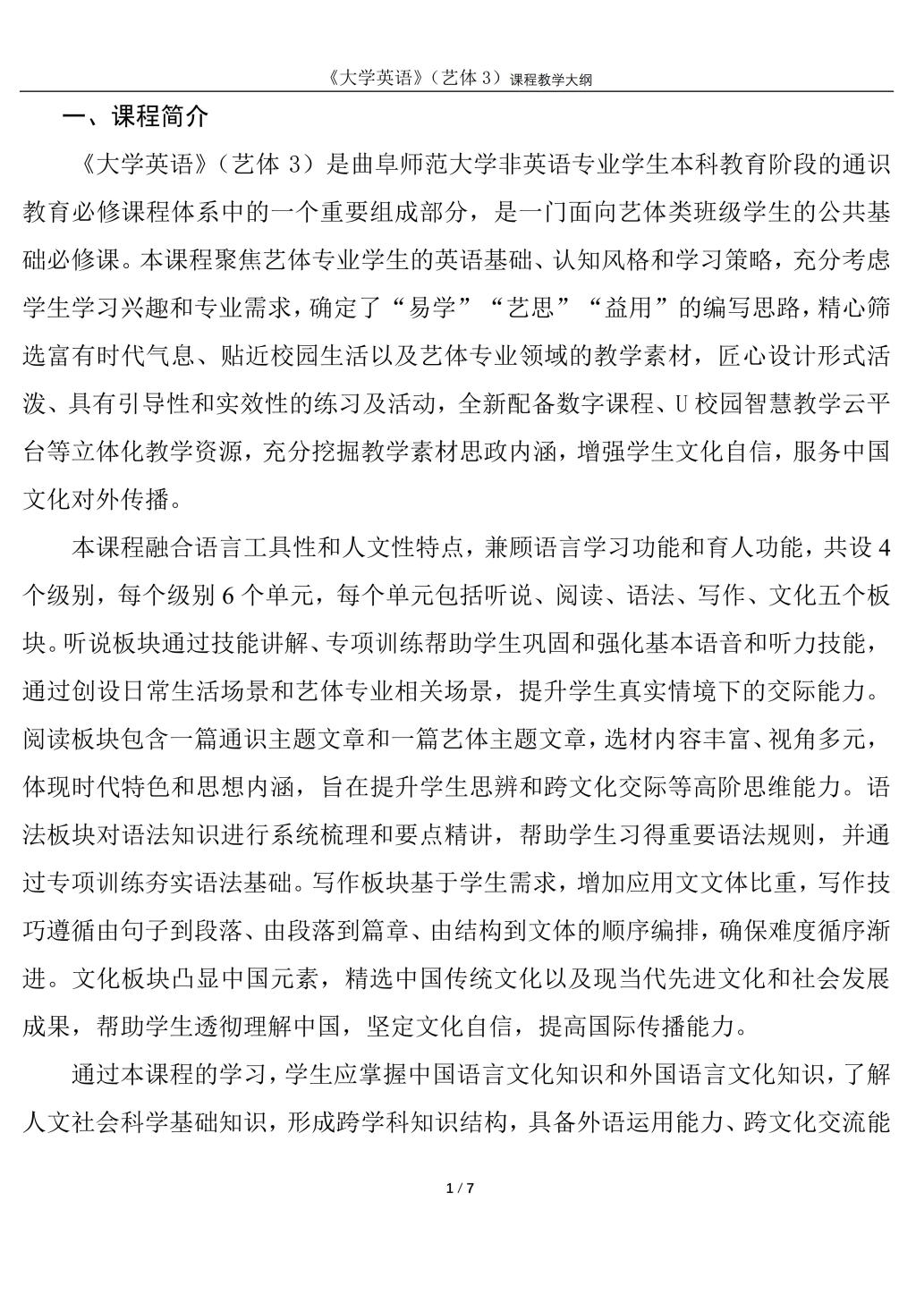 大学英语3(艺体)课程教学大纲(2022版)