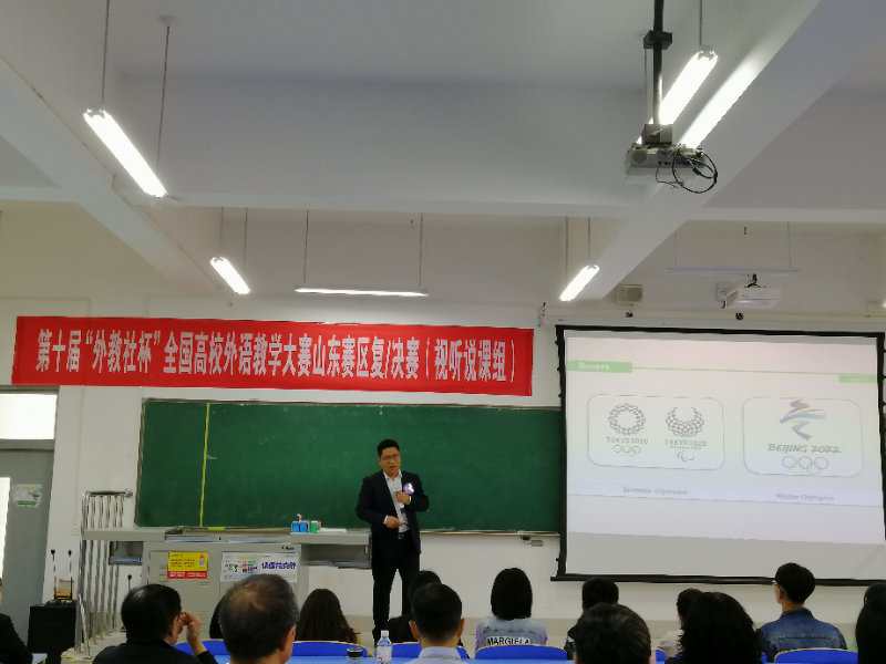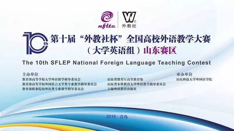 第十届“外教社杯”全国高校外语教学大赛(大学英语组)山东赛区复/决赛于2019年5月18日至19日在山东科技大学成功举行。本次比赛由山东省教育厅高等教育处、山东省本科教育大学外语教学指导委员会和上海外语教育出版社联合主办,山东科技大学承办。比赛分为综合课组、视听说课组和微课组三个组别,来自省内53所高校的85位选手和41个代表队报名参赛。我部推送马艳红参加综合课组、李文彬参加(视)听说组、以及王梅、尹川、朱晓蒙、秦兆荣、蒋珊珊为小组参加微课组比赛。经过初赛、复赛、决赛等比赛环节的激烈角逐,我部推送老师分别荣获综合课组三等奖,(视)听说组三等奖、微课组二等奖的优异成绩。