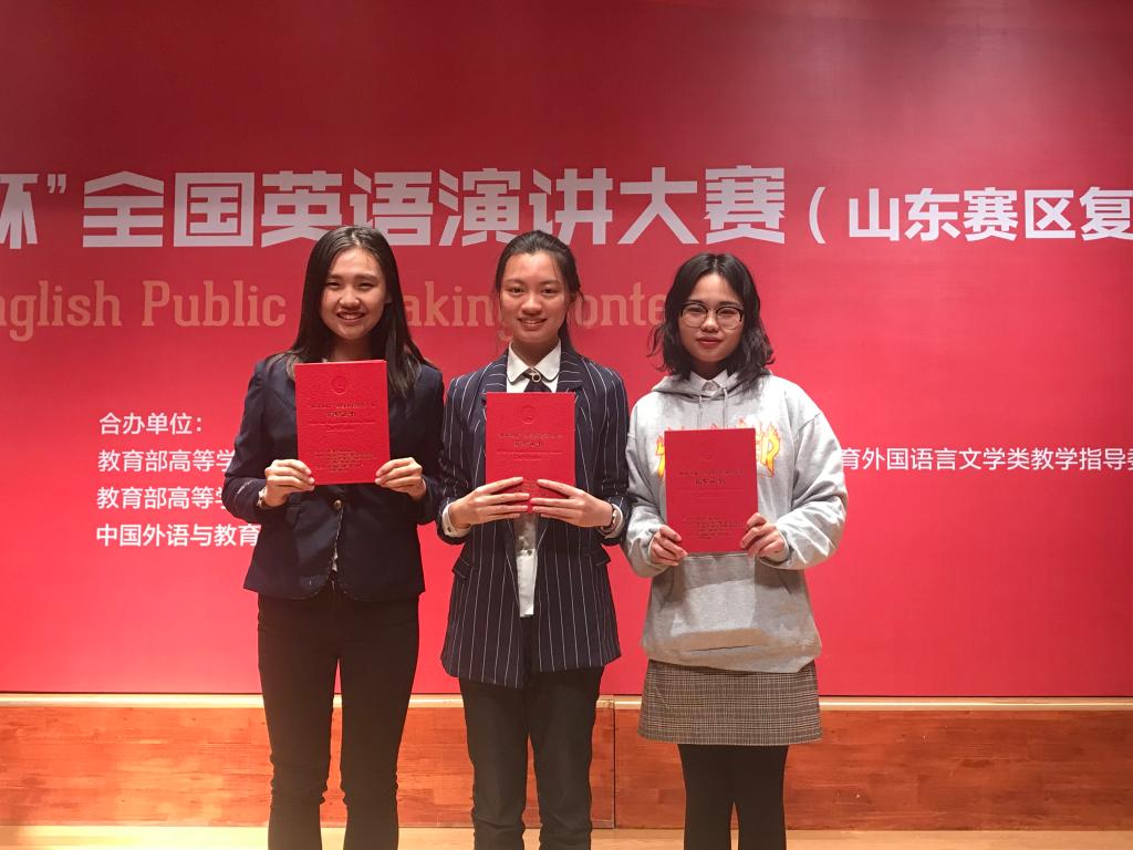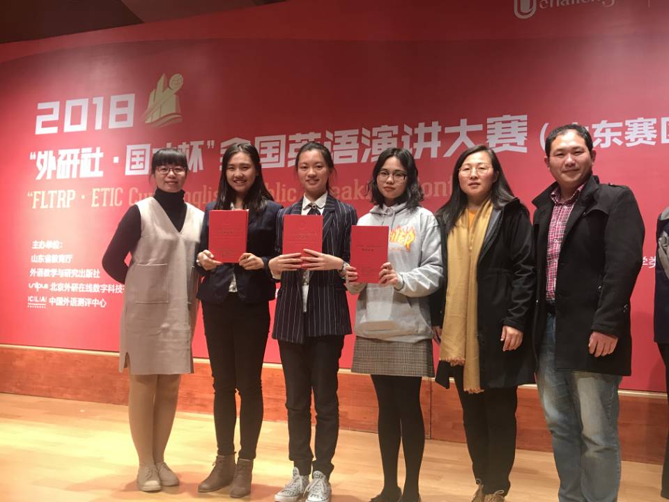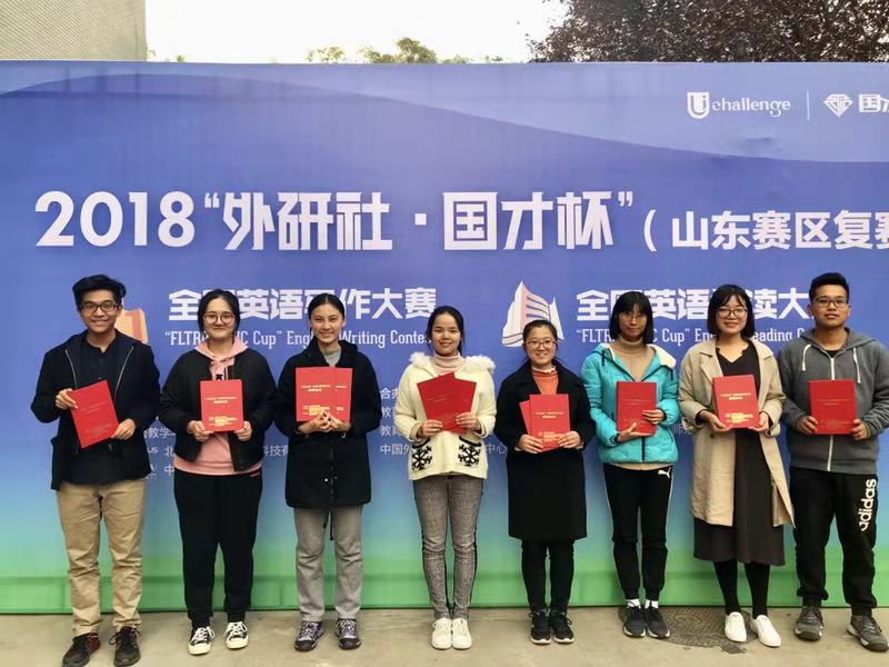 2018年11月3日-4日,2018“‘外研社杯’全国大学生英语挑战赛”山东赛区比赛在济南和烟台两地如期举行,此次比赛包括“‘外研社杯’全国英语阅读大赛”、“‘外研社杯’全国英语写作大赛”和“‘外研社杯’全国英语演讲大赛”三项赛事。环球官方网站_环球(中国)股份有限公司两校区的13名同学在我校衣进韬、孙海珊、满虎、徐欣、秦艳五位教师的带领下参加了本次比赛。经过激烈角逐,我校外国语学院徐欣老师指导的葛宇飞和环球官方网站_环球(中国)股份有限公司齐荣军老师指导的宗宇翔两位同学荣获阅读大赛一等奖,衣进韬老师指导的路璨雯同学荣获阅读大赛二等奖,王燕老师指导的杨春和孙伟老师指导的宋纯嘉两位同学荣获阅读大赛三等奖。张英老师指导的刘涵同学荣获写作大赛二等奖,彭芳老师指导的成晓宁和王显明老师指导的李洛璞两位同学荣获写作大赛三等奖,秦艳老师指导的张朕和门超元老师指导的储文沁两位同学荣获写作大赛优胜奖。另外,满虎老师指导的刘珂含同学荣获演讲大赛二等奖,孙伟老师指导的周先敏同学荣获演讲大赛三等奖,孙海珊老师指导的张涵俐同学荣获演讲大赛优秀奖。