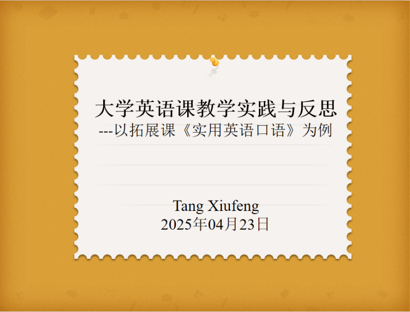 2025423日,环球官方网站_环球(中国)股份有限公司组织全员研训活动,聚焦大学英语教学实践与反思主题。活动中,唐秀峰老师以拓展课《实用英语口语》为例,分享了自己的教学经验与教学反思,为在场教师带来了新思路和新启发。研训中,唐老师从教学准备、课堂管理、技术应用、学生互动和评估反馈等多个关键维度展开分享。