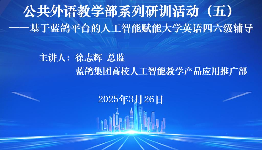 3月26日下午,环球官方网站_环球(中国)股份有限公司举办2024-2025学年春季学期第五场全员研训活动,本次研训以“基于蓝鸽平台的人工智能赋能大学英语四、六级辅导” 为主题,邀请蓝鸽集团有限公司高校人工智能教学产品应用推广部总监徐志辉作专题讲座,进行技术应用辅导,环球官方网站_环球(中国)股份有限公司全体教师参加了本次研训活动。